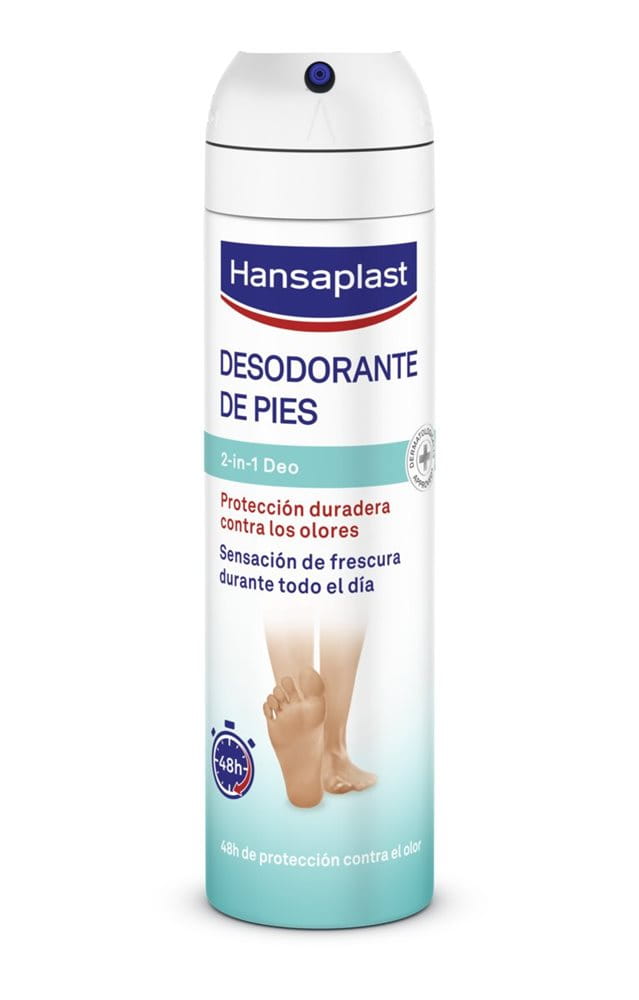 El Spray Desodorante 2 en 1 Refrescante de Hansaplast proporciona protección duradera (48 horas) frente a los olores a la vez que refresca sus pies. Además, ayuda a prevenir la aparición del pie de atleta.